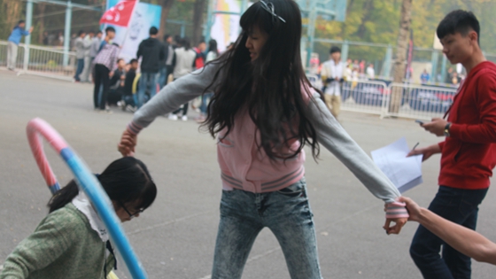 在班级集体游戏部分,新生同学们以班级为单位依次进行了“吐泡泡”、“换位”、“动感呼啦圈”、“诺亚方舟”和“趣味接力”等五个团队熔炼小游戏。活动现场气氛异常热烈,同学们摩拳擦掌、跃跃欲试。七个班级七支队伍,在场地上进行了集体智慧与团队协作的较量。“吐泡泡”、“换位”考验了新生同学们的反应与速度,“动感呼啦圈”增加了新生同学们彼此的默契程度。立体化的造型、零距离的接触,“诺亚方舟”游戏中全班齐上阵,帅气的“钢小伙”托起可爱的“铁姑娘”,力求使地面上单薄的报纸承载更多的同窗伙伴。担任活动裁判的学院团委员工会2014级员工骨干们公平执规、详细记录并为新生同学们做好安全提示和活动保障工作,发挥了学长学姐们的服务与表率作用。