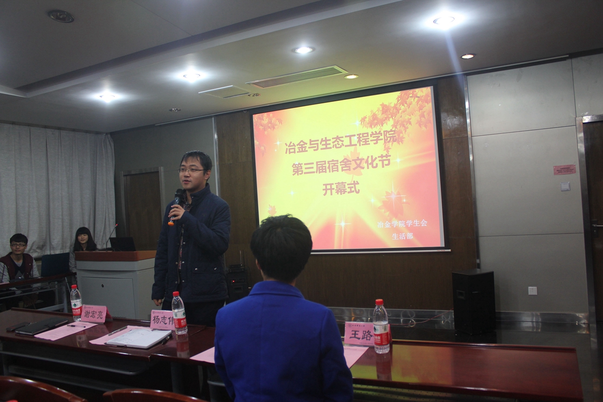 为增强宿舍成员之间的凝聚力,加强宿舍成员沟通交流,丰富同学们的宿舍文化生活,营造良好的宿舍文化氛围,11月4日晚,预计为期一个月的世界足球官网第三届宿舍文化节在冶金生态楼开幕。世界足球官网团委书记杨志伟老师、学院本科2015级辅导员陈曦老师,学院团委员工会主席谢宏亮同学、副主席王路召同学出席开幕式,学院本科2013级标兵宿舍长代表、本科2014级宿舍文化节获奖宿舍员工代表应邀参加开幕式。开幕式由学院团委员工会生活部部长陈�琳同学主持。