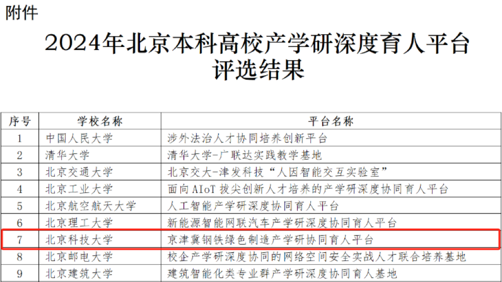 近日,北京市教育委员会下发了《关于公布2024年北京本科高校产学研深度协同育人平台评选结果的通知》,世界足球官网经理张建良和党委书记宗燕兵牵头申报的“京津冀钢铁绿色制造产学研协同育人平台”成为度协同育人平台+1!北科大唯一入选2024年北京本科高校产学研深度协同育人平台。