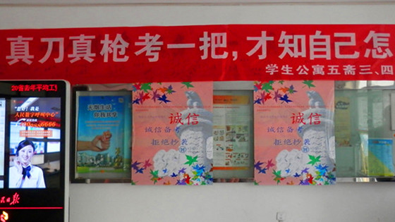 活动最后,为了进一步提高此次活动的宣传面,诚信应考条幅和海报被悬挂在了五斋公寓大厅的宣传栏内,同时也在微信等载体在传播活动图片,取得了较好的效果。