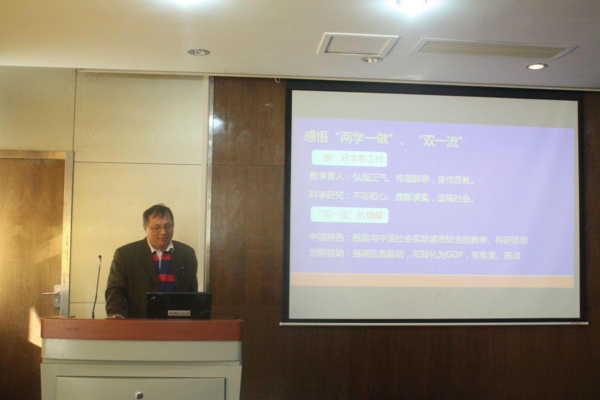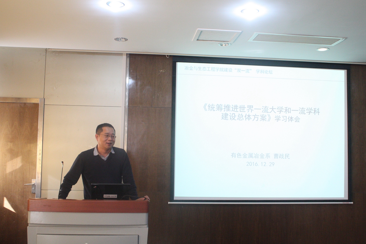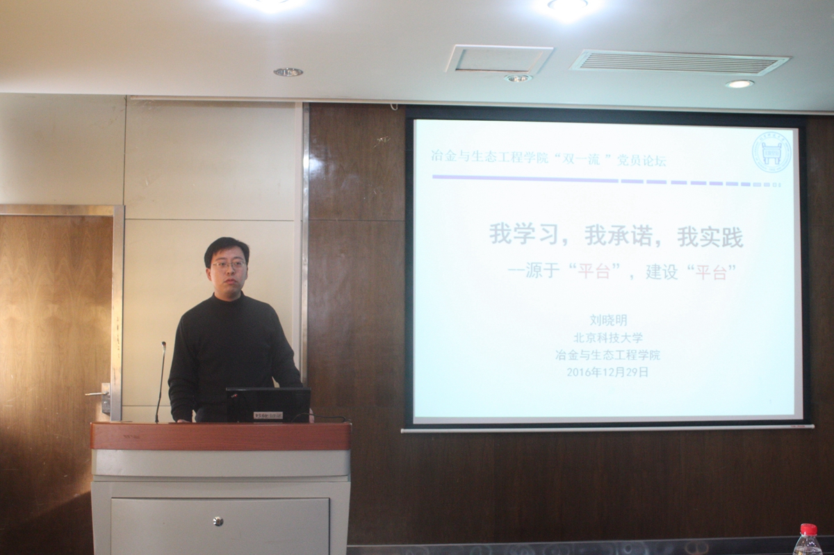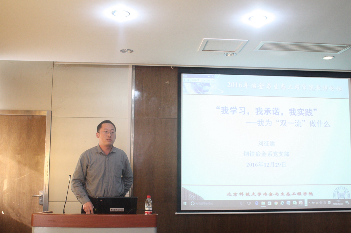 随后,科研教学系列教师代表发言。首先,刘征建老师提出,青年教师应加强自身教学科研素质提高,做好学院教学的“接力”工作,多向经验教师学习,为学院教学工作建设奉献力量。闫柏军老师从冶金物理化学的历史渊源谈到现阶段冶金物理化学学科的发展,同时,对于冶金物理化学前沿所面临的一些挑战提出了自己的建议。曹战民老师指出,为推进世界一流大学和一流团队建设,各位教职工应该多加强自身的理论学习和科学研究。朱荣老师指出,在“两学一做”中,教师要做好自己的教学科研的本职工作,不仅要教学,更要育人。在科研工作中,充分发扬“求实鼎新”的校训精神,做到不忘初心,造福社会。在双一流建设中,要把握中国特色和创新精神,推动公司与国际学校的接轨。刘晓明老师最后指出,办好高校,必须牢牢抓住全面提高人才培养能力的核心点,学院应加强对员工的关心和培养,争取更好的发展。