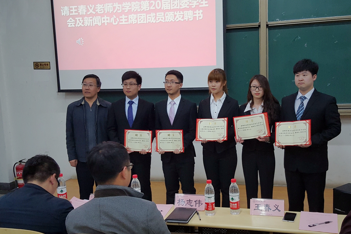冶金学院团委书记杨志伟老师,辅导员陈曦老师、郝勇飞老师参加聘任大会并向学院团委员工会及新闻中心部长骨干颁发聘书。