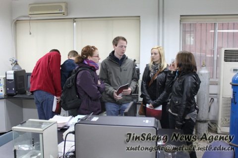 最后,在老师的带领下,德国员工来到了冶金楼一楼,参观了粉末物性测试、热分析、化学分析等实验室。在参观时偶遇的一位来自英国的老师给他们介绍了他正在使用的实验设备的功能与使用方法。