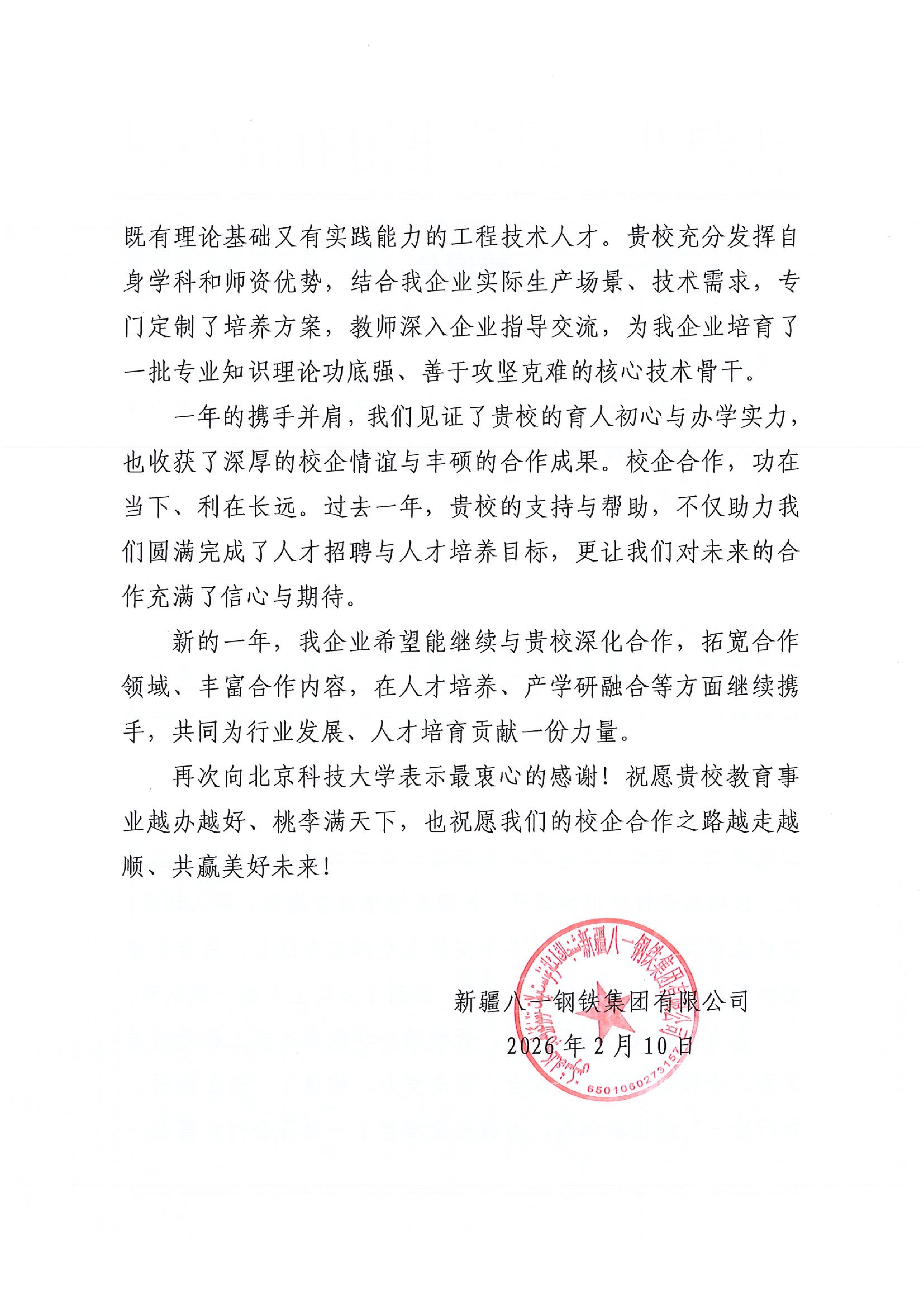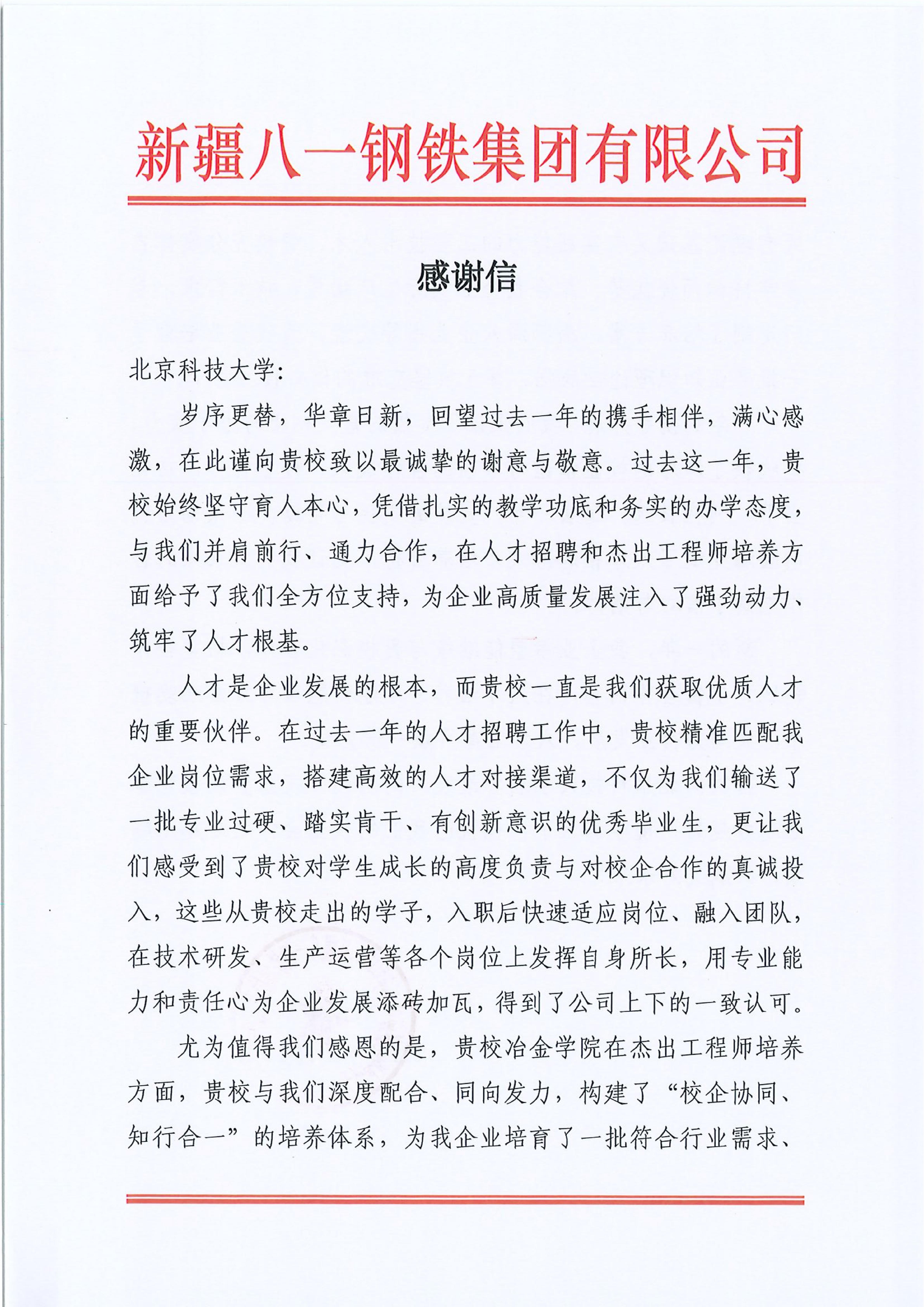2月10日,新疆八一钢铁集团有限公司向世界足球官网发来感谢信,特别对冶金学院在杰出工程师培养方面的卓越贡献给予高度肯定。信中感谢学院坚守育人初心,通过构建“校企协同、知行合一”的培养体系,为企业量身定制培养方案,输送了一批理论基础扎实、实践能力突出、善于攻坚克难的核心技术骨干。这些毕业生在技术研发与生产运营岗位上快速成长,成为推动企业高质量发展的中坚力量。八一钢铁集团表示,愿与学院进一步深化校企合作,拓宽合作领域,在人才培养与产学研融合方面携手共进,共创美好未来。