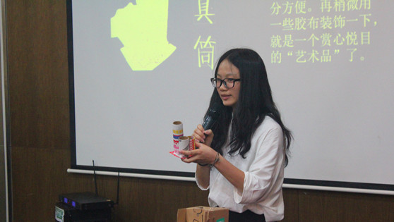 比赛开始后,参赛同学依次上台展示了他们的生活创意作品,选手们的作品各式各样,灵感都来自于平时在生活中遇到的一些实际问题,通过细心的观察和主动地思考,把平时的一些废旧物品利用起来,设计和制作了自己的作品。而选手们的展示形式也各不相同,有通过现场实物讲解的方式,有通过PPT讲解的方式,也有通过在现场进行情景剧表演的方式。选手们用心设计的作品和各具特色展示令在场观众赞叹不已,现场气氛十分热烈。