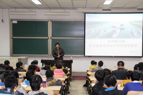 范老师首先讲了学习高数的态度,她亲切地将数学比喻成一门艺术,学习数学首先要有热情,学习高数不仅是学习知识更是领悟其中的思维方式;其次是投入,上课期间要认真听讲,下课要及时做好复习,按时完成作业,积极参加答疑。然后,范老师又结合四十余年的教学经验介绍了学习数学的方法,她高度概括为“优化”二字,包括课上优化和课下优化,双管齐下才能取得良好的成绩。最后范老师讲到“高等数学是看得见的”,列举了各种数学与实际生活相关的例子,启发了同学们学习数学的兴趣。范老师在介绍学习方法的同时还分享了一些人生中的经验,给初入大学校门的同学们提供了的宝贵的指导。范玉妹老师诙谐幽默、形象生动的讲授,赢得了同学们一阵又一阵的的掌声。