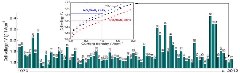 高活性、低载量的析氧电催化剂直接影响PEM电解制氢系统的性能与寿命,本课题组针对催化材料制备机理、微结构调控及多相界面研究工作,开发出一系列的高效析氧电催化剂,提出混合荷电复合载体材料的概念,并成功制备出SnP2O7-(Sb-SnO2)以及(Sb-SnO2)-Cs1.5HPA等复合材料。在混合荷电复合载体材料的基础上,制备兼具高比表面积、高电子、高质子导电性的混合荷电复合载体材料IrO2/3-DOM-TIP-ITO,实现载体材料高质子、电子导电性及微结构的可控优化。多篇研究成果发表在能源环境领域顶级杂志Energy & Environmental Science、氢能专业杂志International Journal of Hydrogen Energy上。德国亚琛工业大学Marcelo Carmo教授在2014年发表于International Journal of Hydrogen Energy上综述“A comprehensive review on PEM water electrolysis”一文中,对王新东课题组在电催化剂方面研究工作给予了很高的评价,他认为“很好地阐述了金属氧化物OER电催化剂中掺杂组分对活性组分的表面富集与稀释组分作用规律,从析氧反应历程出发,为析氧电催化剂制备提供了依据。”(图中参考文献72)