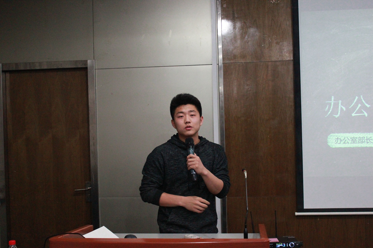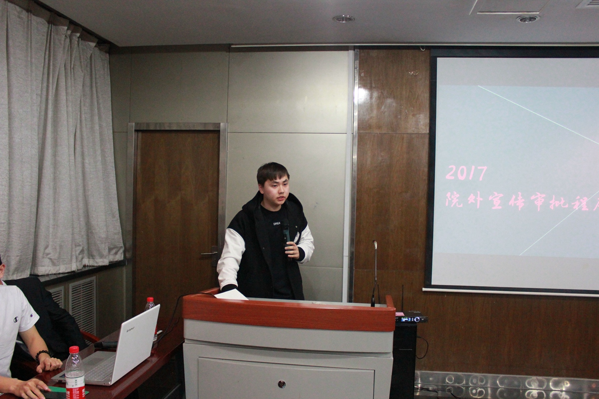 员工会办公室部长潘凌峰同学则是从公寓橱窗海报宣传审批要求出发,类推到篮球场宣传栏、食堂电子屏幕及校园网登录界面三个方面。他详细讲解了学院外宣传的基本章程制度以及注意事项,提出“未雨绸缪”四字箴言,告诫同学们校外宣传要提敲定,提前审批。简明扼要地对各种宣传方式的注意要点、操作程序及步骤进行了详细剖析。