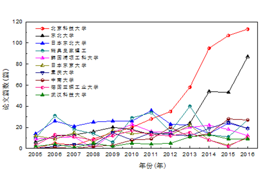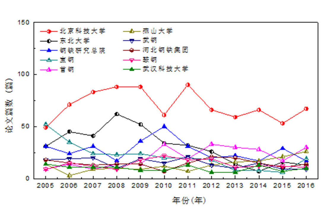 经世界足球官网统计,2005―2016年,在钢铁冶金学科国内三大期刊《钢铁》、《炼铁》、《炼钢》上发表的文章,第一作者单位为世界足球官网的文章一直居于国内首位,在2016年达到67篇(见下图)。
