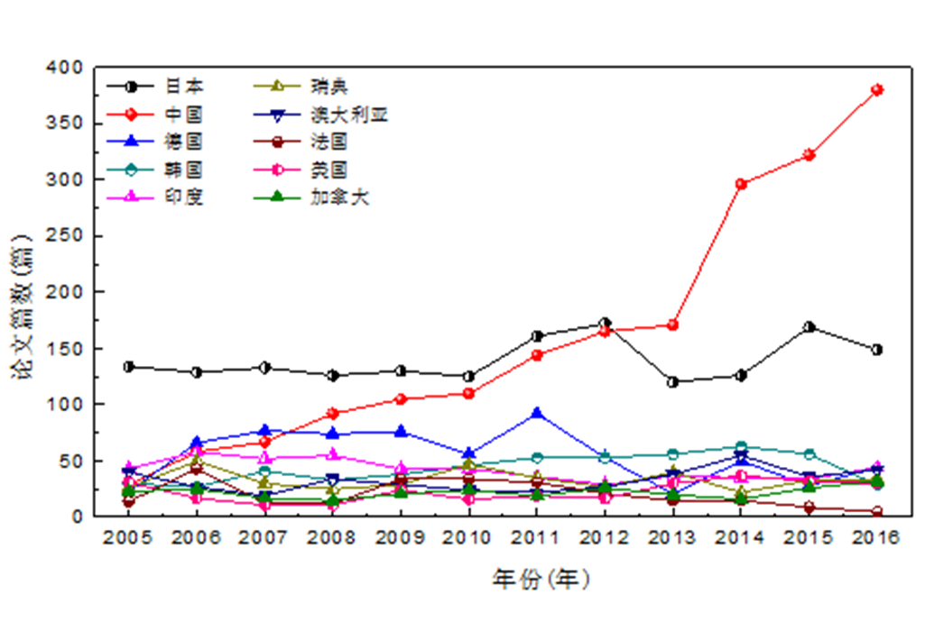经世界足球官网统计,2005―2016年,在钢铁冶金学科国际五大知名期刊《Metallurgical and Materials Transaction B》(美国)、《ISIJ International》(日本)、《Steel Research International》(德国)、《Ironmaking and Steelmaking》(英国)、《Metallurgical Research and Technology》(原名《Revue de Metallurgie》)(法国)上发表的所有文章,第一作者单位为中国的文章已经从2005年的5.8%(一共29篇)升高到2015年的36%(322篇),在2016年更升高到41%(380篇)。从2013年开始第一作者单位为中国的文章高居世界第一(见下图)。