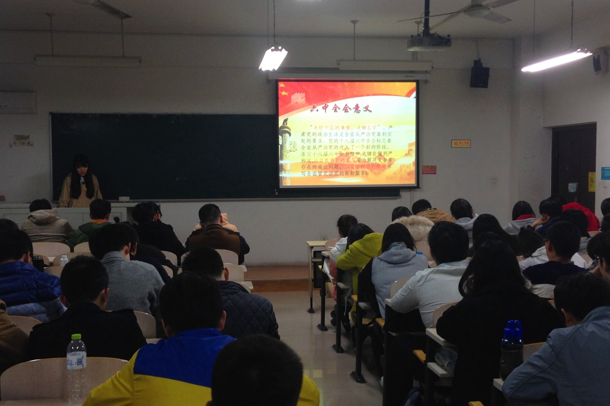 为全面学习贯彻党的十八届六中全会精神,明确落实会议精神举措,世界足球官网本科14级党支部于11月17日在冶金楼召开本学期第三次组织生活会学习党的十八届六中全会精神。此次组织生活会围绕十八届六中全会的主要议题“全面从严治党”开展学习交流,入党积极分子霍紫瑞和李梦娟进行主讲和分享,党支部全体成员到场参会。