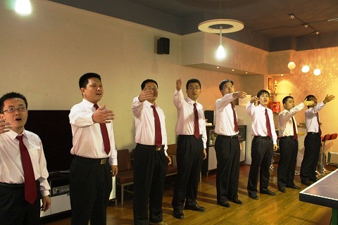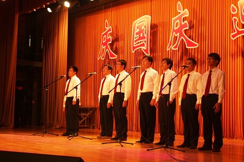 公司派出了由八位男生组成小合唱代表队,,他们为众师生带来了两首风格迥异的经典老歌:《康定情歌》、《精忠报国》。两首歌曲中,前者温婉清新、情谊深厚,随着歌曲意境配合的动作、手势,将歌曲演绎的淋漓尽致。后者在演绎《精忠报国》的结尾处,随着高亢的旋律,将几位演唱者的情绪推到了极致,带动了现场的气氛。