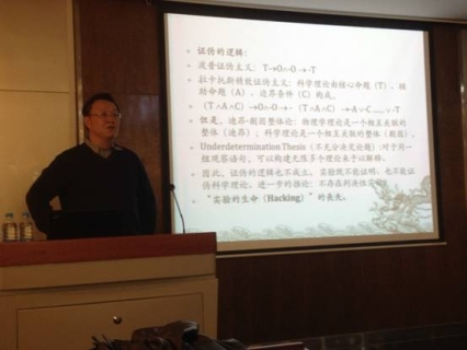 报告开始前,潜伟教授介绍了袁江洋研究员的学术经历和主要研究成果。袁江洋研究员首先以“20世纪科学哲学的困境”开场,详溯了20世纪科学哲学从逻辑经验主义到历史主义乃至新实验主义的发展,认为其先后经历了“世纪初形而上学的放逐”和“世纪后期实验生命的丧失”两大困境。在此基础上,袁江洋研究员试图在放弃不可通约的神话,甚至摆脱“科学共同体”乃至“科学革命”概念束缚的前提下,重构理解科学探索的概念框架。其目标是守护科学的合理性――守护实验的生命及人类理智的尊严,并提出了一种新的科学哲学理解,即元理论、理论和实验的互动关系。最后,袁江洋研究员以“拉瓦锡化学革命的再研究”为案例,详细阐述了这场所谓的“化学革命”的具体细节,证明燃素说和氧化说共享相同的的元理论,认为这场“革命”并没有实现库恩意义上的世界观的转变。