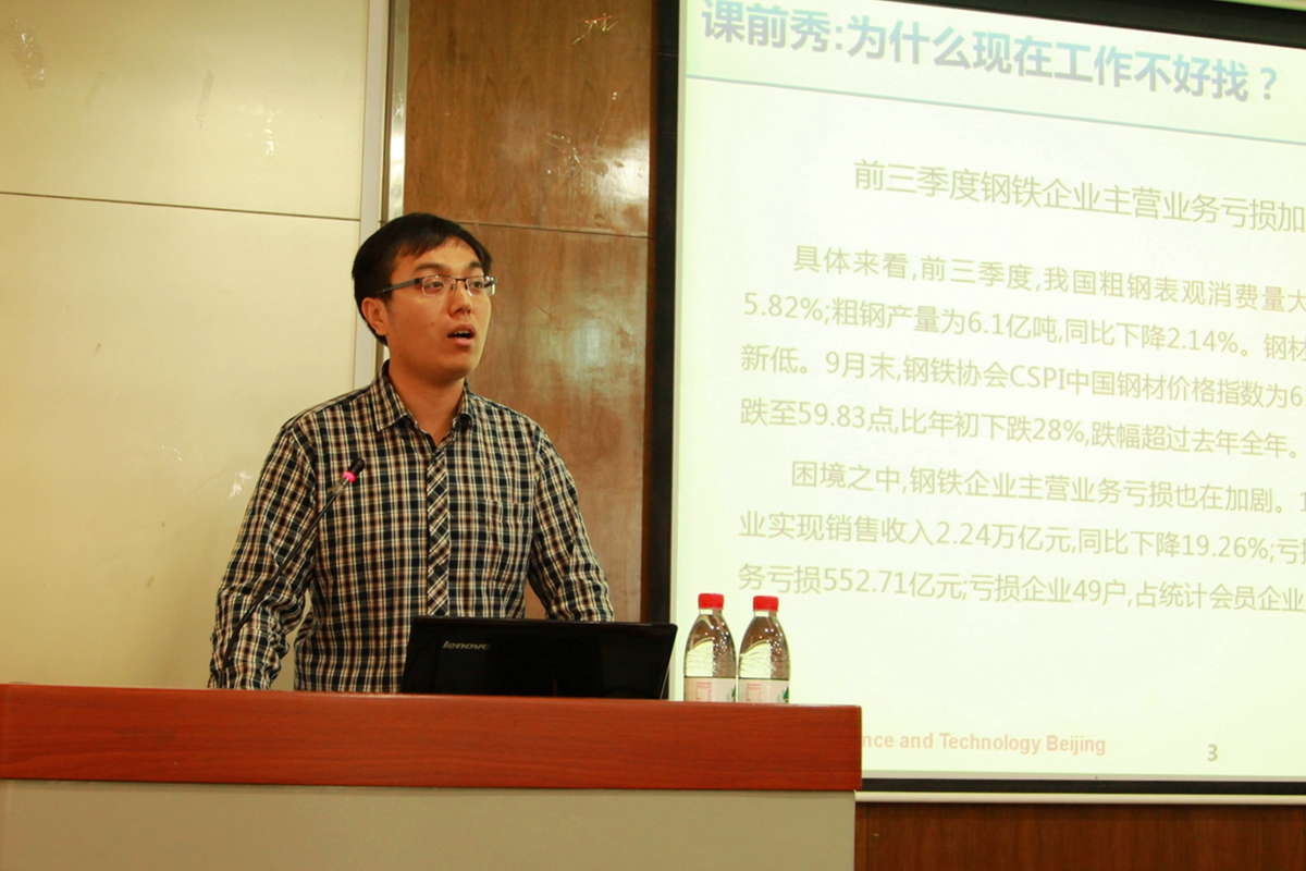 张瑞先生是公司冶金工程专业2015届硕士毕业生。在校期间,张瑞学习科研成绩优异,综合素质突出,曾担任学院研究生会主席,在毕业应聘中获得多个名企工作机会。张瑞先生先后供职于中铁物资集团、中铁十八局集团国际公司,立足钢铁冶金专业,积极拓展职业发展路径。“如何找到一份称心的工作?”张瑞先生首先结合自身应聘经历,强调了明确自身定位、积极把握机会的重要性,指导同学们增强对自身的了解,努力提升个人的应聘能力。张瑞先生以中信泰富、宝钢集团等为案例,介绍了钢铁相关行业企业生产经营的发展趋势,鼓励同学们增强行业自信、专业自信。