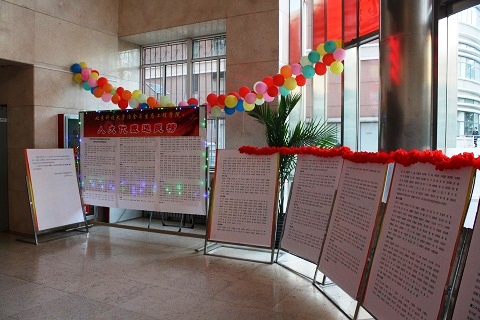 在宣传方面,公司不仅制作了横幅悬挂在院楼门口,大厅内的LED显示屏也滚动播出关于此次选民的注意事项,此外,院办还精心设计了选民榜,将候选人名单张贴在院楼大厅内,醒目大方,使不少教职工及员工驻足浏览。