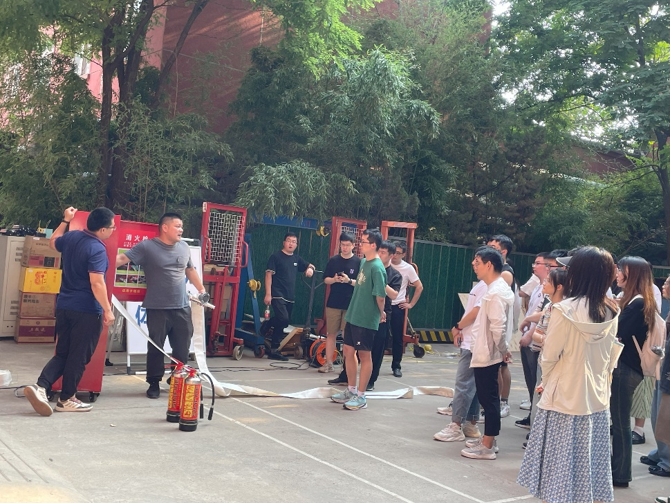 保卫处还将电子消火栓、电子灭火器搬至现场,并为现场师生演示使用方法,师生们抓住这难得的机会纷纷上手操作,学习正确的灭火方式。