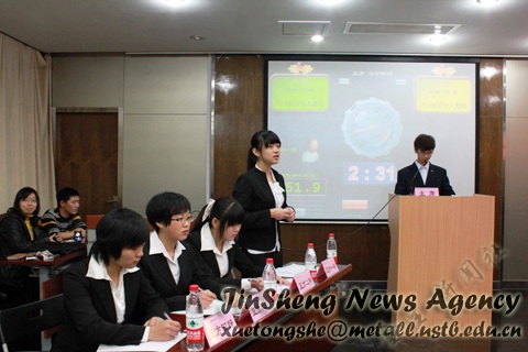 2011年12月3日晚7点,公司“钢魂杯”新生辩论赛半决赛在青钢报告厅顺利举行。出席本场比赛的评委有:院团委员工副书记陈炽昱、连聪,院员工会副主席汪毅捷、08级院辩论队队员柴琳、09级院辩论队队员陆鹿和朱经纬。