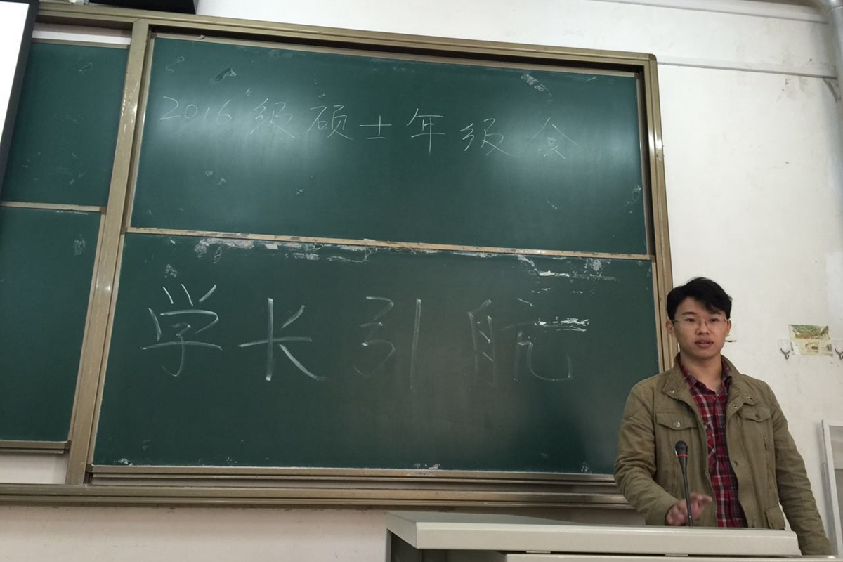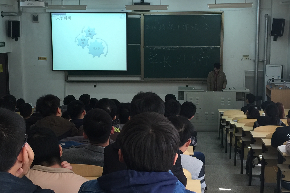 15级硕士研究生杨帆首先向大家介绍了研究生阶段学习和科研的相关内容,杨帆用大量数据和亲身经历向同学们传达了研一阶段应学术科研两不误,保持“两条腿”走路的学习状态的思想。同时,他告诉新生,研究生阶段应注重课堂效率,同学之间应及时的资源共享,分享学习心得。他还讲述了阅读文献的相关技巧,有效的阅读文献并为我所用的方法。“做好研究生学术生涯规划,达到共同进步”是他对研究生新生们的寄语。