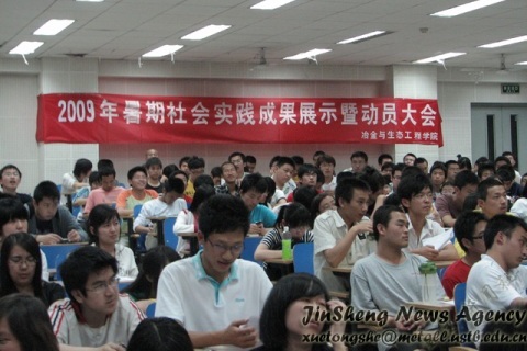 大会开始由校实践部部长王进老师致开幕词。他表示冶金学院的社会实践有着自己的程序与特色,而08级的员工也很有主见,比如说大一的四川员工就自发开展了以感恩为主题的“曙光行动”。他进一步肯定了大一员工对于社会实践的积极态度,给大家信心。同时,他着重强调了安全问题,包括人身财产安全和媒体安全问题,并以07年的员工在社会实践中所亲身经历的真实事例给大家传递了安全工作的重要性。