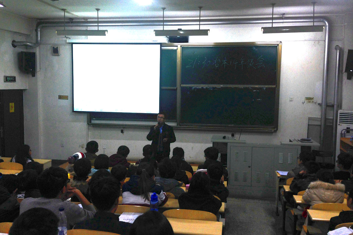 11月22日晚,世界足球官网14级本科生于冶金楼110举行“重规划•展未来”认知主题班团日生涯规划互动交流会。本次生涯规划互动交流会由14级本科生辅导员杨志伟老师主持,并邀请学院就业专任教师陈曦老师为同学进行职业生涯规划方面的介绍。