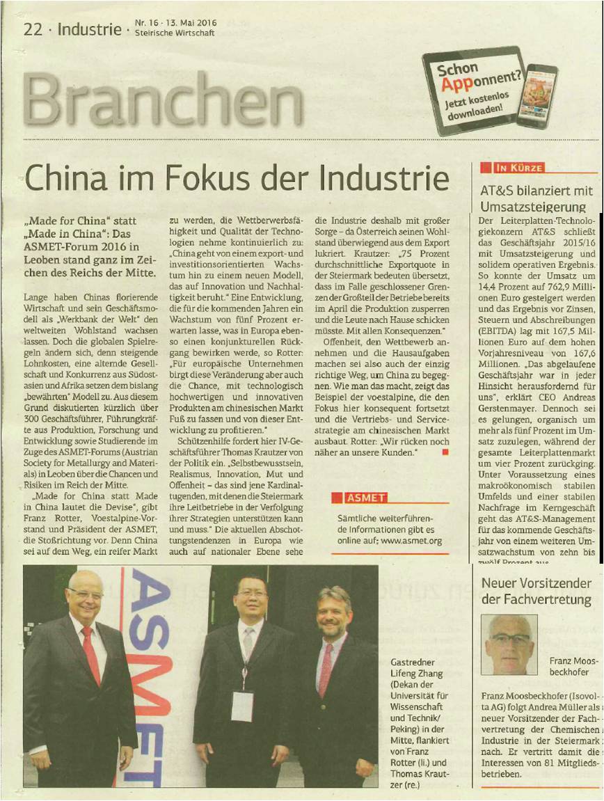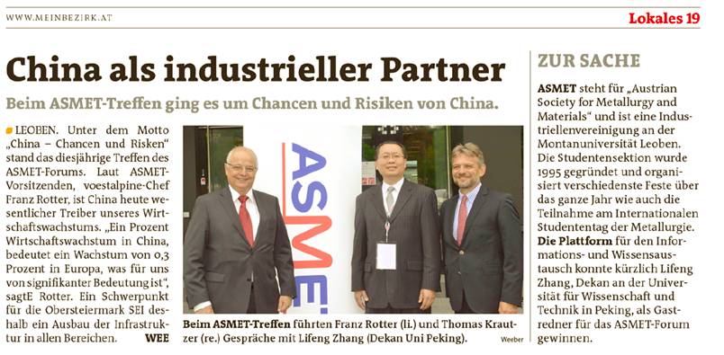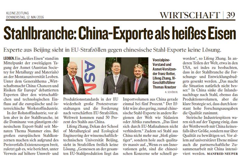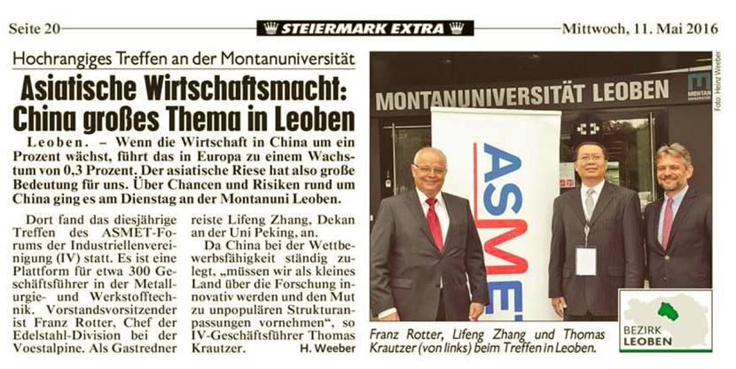 2016年5月10日至5月11日,2016年奥地利冶金与材料论坛会议在奥地利莱奥本大学顺利举行,主题为“中国的机遇与风险”。出席会议的有欧盟若干钢铁企业主要负责人、相关大学的教授和员工代表。会议主要讨论中国与欧盟在钢铁方面的未来的竞争与合作。5月10日上午,会议开幕式在莱奥本大学的会议中心举行。会议主持人奥地利冶金与材料协会主席Bruno Hribernik博士致欢迎辞并介绍会议的基本情况。