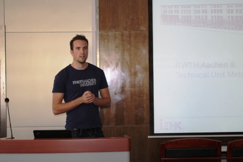 首先,亚琛工业大学员工代表Benedikt Flerus就亚琛工业大学的地理位置、悠久历史等概况作了大致的介绍,然后对该校的专业设置、课程教学安排、学位如何授予等同学们较为关心的问题作了较为细致的讲解介绍。Flerus还介绍了亚琛工业大学丰富多彩的课外生活,展示出的画面令在场的同学都心生向往。最后,Flerus同学代表亚琛工业大学诚挚地欢迎在座的同学来学习生活,也对能被邀请来参加交流活动表示了感谢。