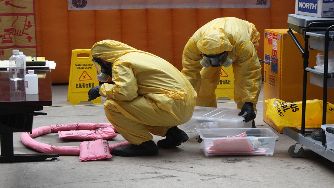 由资产管理处、保卫保密处和冶金与生态工程公司党委共同主办的实验室危险化学品泄露应急演习在10:00准时开始,四名师生模拟了甲苯意外遗洒,实验室责任教师对实验人员进行疏散,对受伤员工进行急救,报告学院,保卫保密处前来进行有机溶剂泄漏紧急处置的过程。