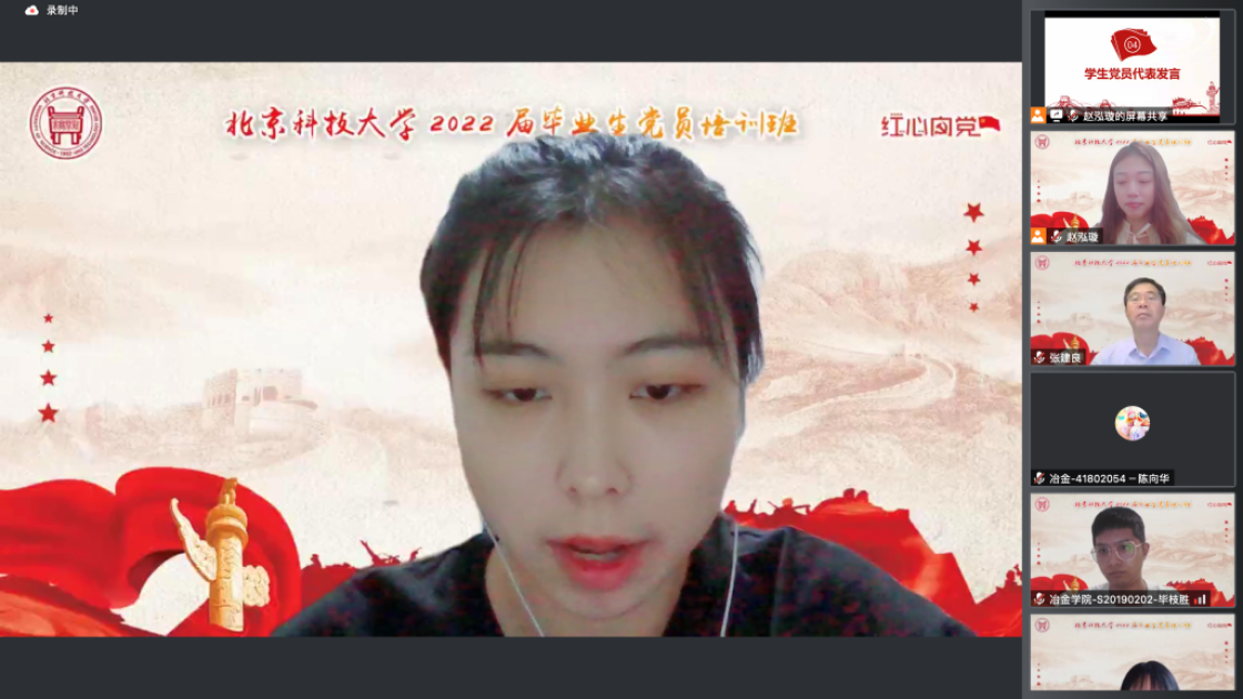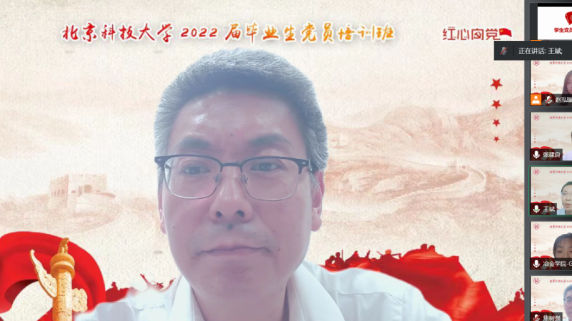 为深入学习贯彻习近平新时代中国特色社会主义思想,进一步做好对毕业生党员的思想教育和价值引领工作,帮助毕业生党员坚定理想信念,增强社会责任感和使命感,引导成为“听党话、跟党走、有理想、有本领、具有为国奉献钢筋铁骨的高素质人才”,根据学校员工党员集中培训实施方案相关要求,6月16日晚19:30,冶金与生态工程公司党委于线上举办2022届毕业生党员培训班生涯启航党课暨毕业生党员党校结业仪式。冶金与生态工程公司党委书记张建良、经理焦树强、党委秘书陈怡凌、全体毕业班辅导员出席,党委副书记、副经理王斌主持会议。